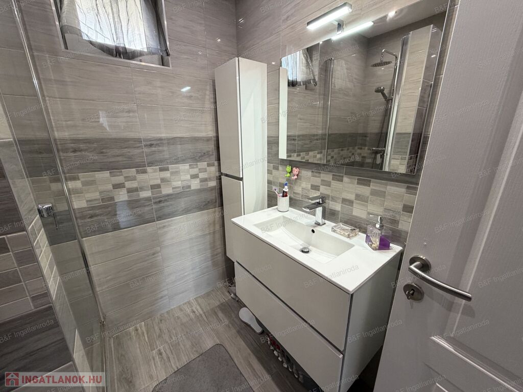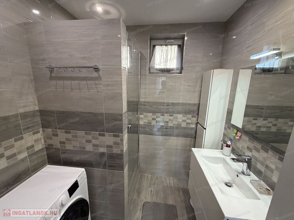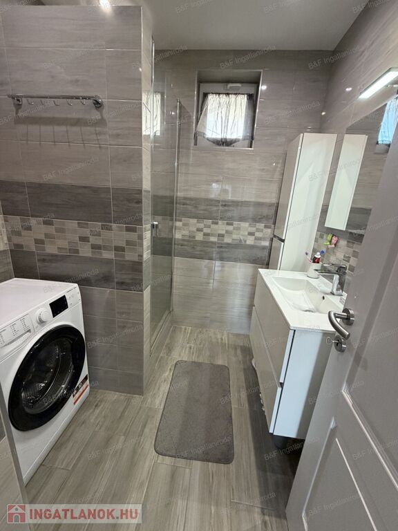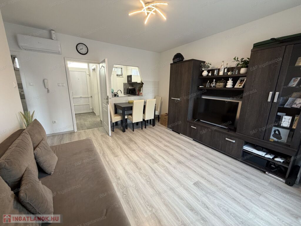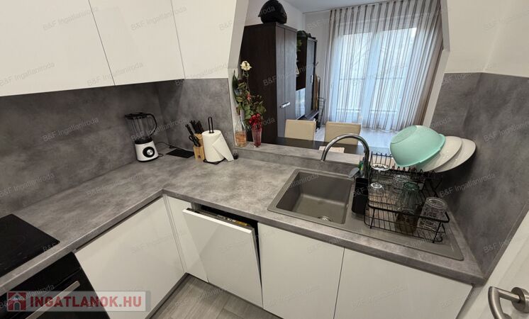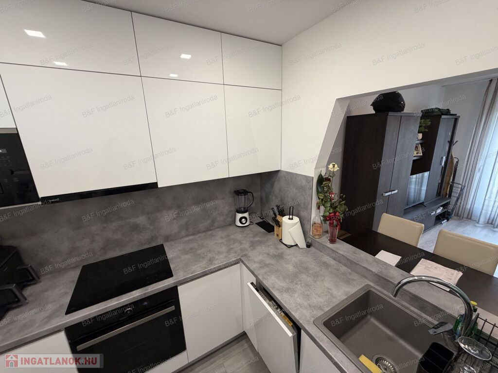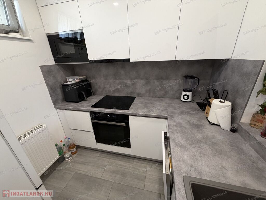 Gépesített konyhával (beépített sütő, kerámia főzőlap, beépített mikró, mosogatógép, hűtő, páraelszívó), étkezővel, tágas nappalival és szép fürdőszobával várja új lakóit.